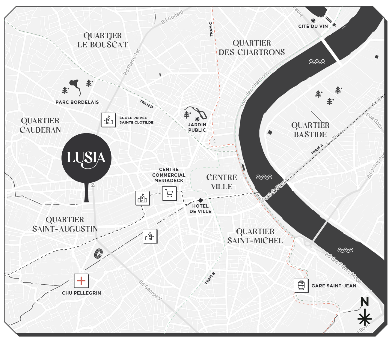 LUSIA est une résidence intimiste haut de gamme de 14 biens d’exception avec terrasses et jardins dont 5 prévus essentiellement pour du Coliving. Au croisement des quartiers Caudéran et Saint-Augustin et à 10 minutes en tramway du centre ville, elle est idéalement située.